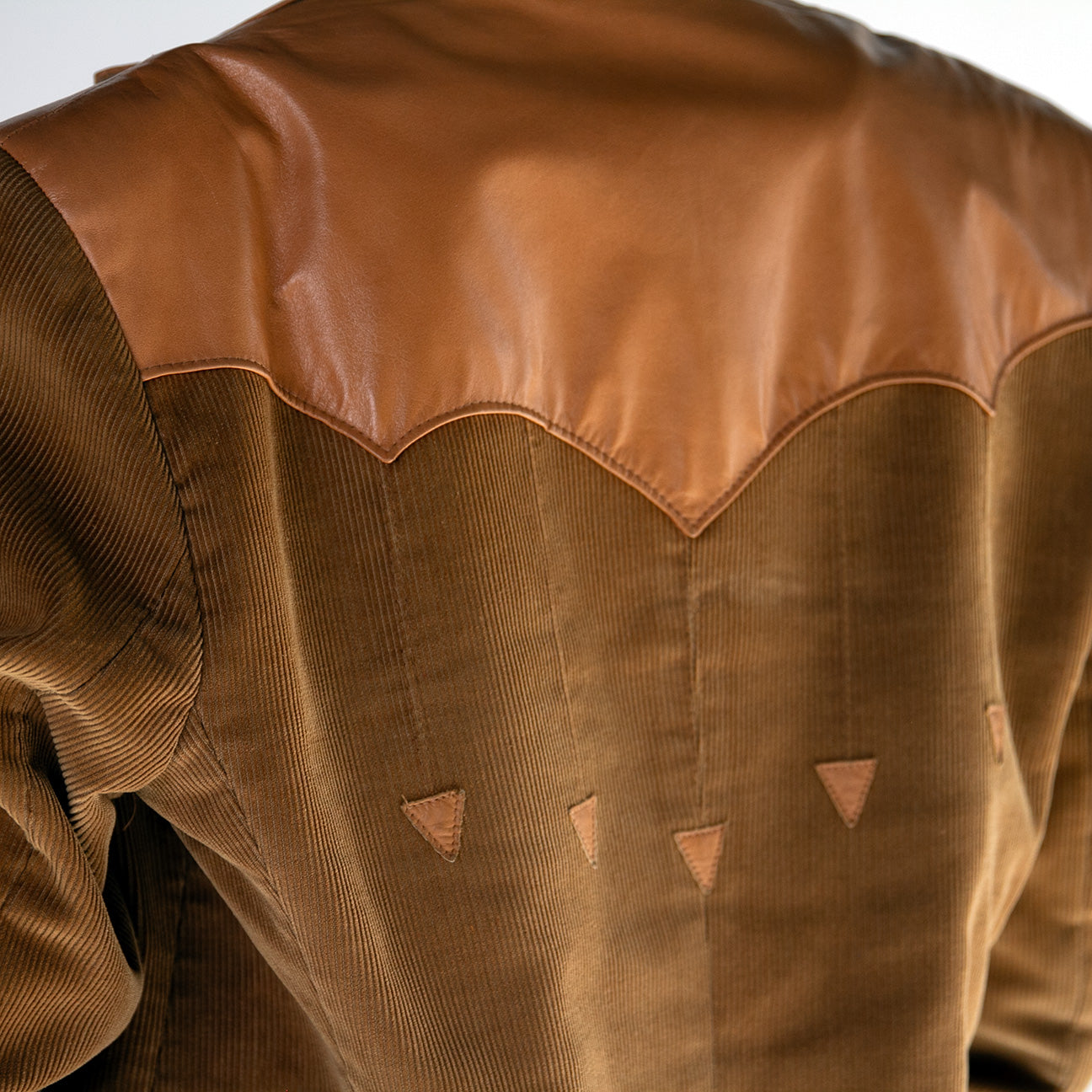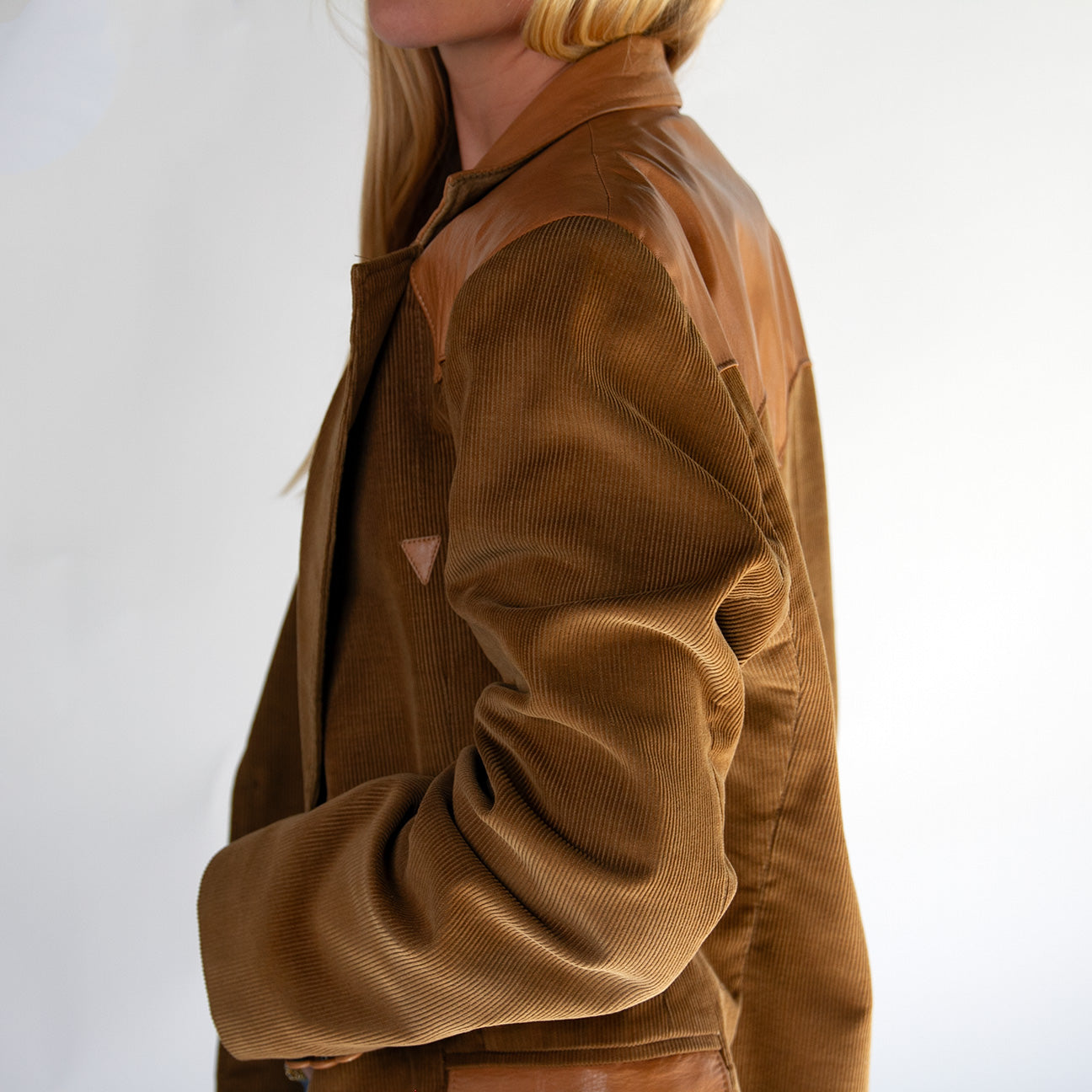 Sophisticated vintage caramel leather and corduroy blazer, blending rich textures for a timeless look. Features supple leather shoulders and detailing that add a refined touch to the classic corduroy body. The structured silhouette offers both style and versatility, making it perfect for any wardrobe.