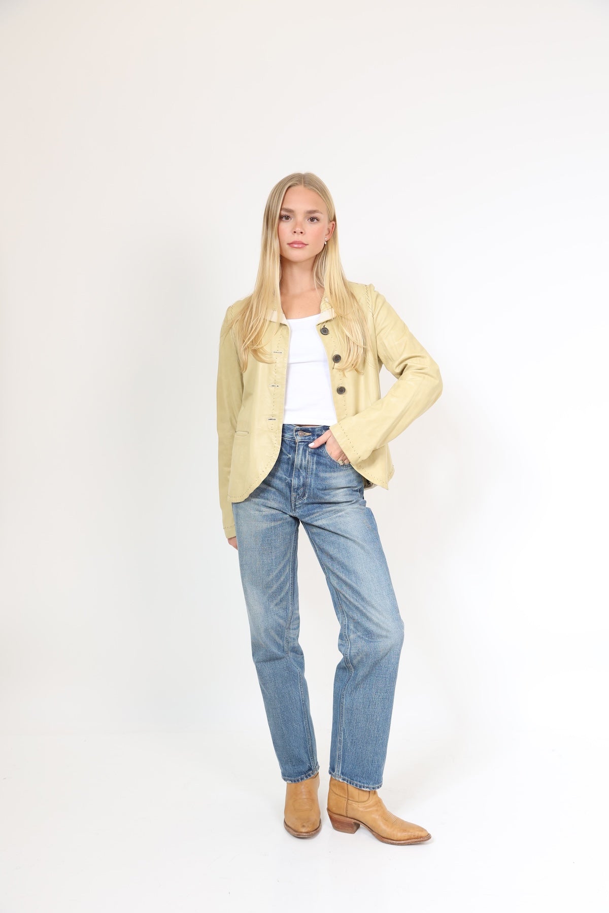 A rare find in the softest butter-yellow leather. This vintage blazer brings a refined western touch to classic tailoring, featuring curved lapels, contrast stitching, and a flattering fitted silhouette. Lightweight and smooth to the touch, it’s an easy layer that transitions from day to night.